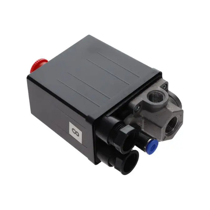 Pressostato a 4 vie con attacco da 3/8″, ideale per il controllo automatico della pressione in impianti ad aria compressa. Supporta una corrente fino a 16A e una pressione massima di 16 bar, garantendo affidabilità e sicurezza nel funzionamento del compressore. Struttura robusta e compatibile con la maggior parte dei serbatoi e impianti standard. Facile da installare e regolare.