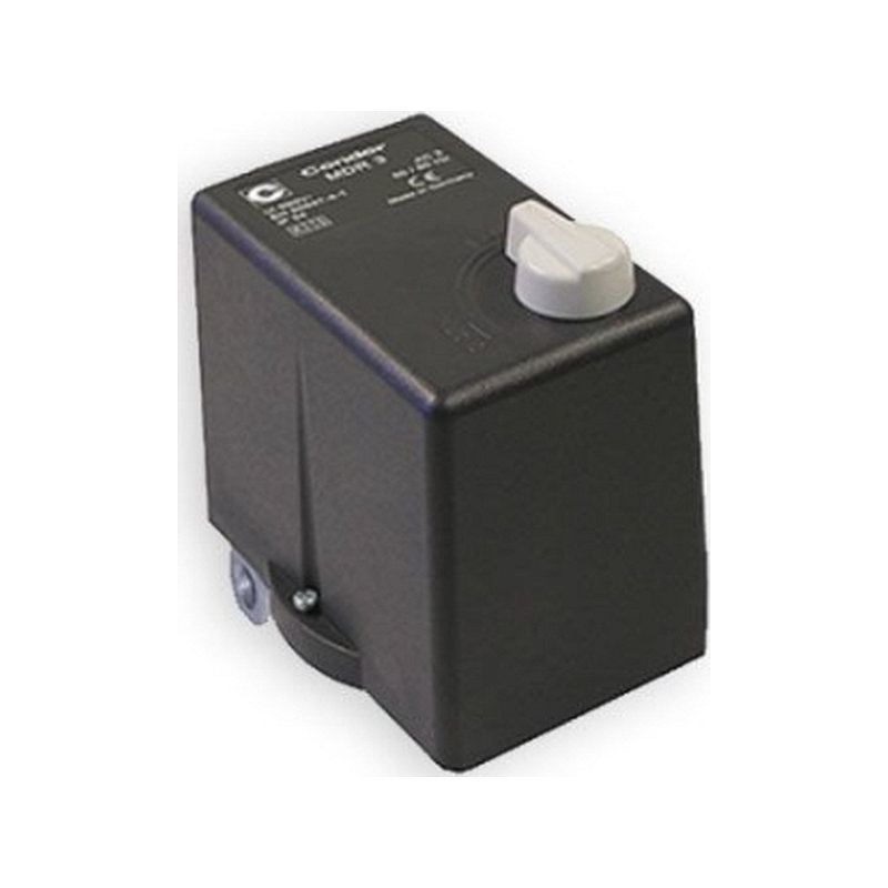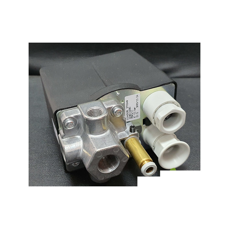 Pressostato a 4 vie con attacco 3/8″, completo di valvola MDR3/11 e raccordo R3/10. Pressione massima 10 bar. Ideale per il controllo automatico di compressori e impianti ad aria compressa, affidabile e facile da installare.